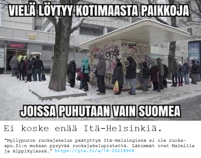 Yhteiskunta Meemi 12 maaliskuun, 2026 Tuppu Jätä kommentti Ratkaisu leipäjonoihin. Kun ruoka loppuu, niin ei tarvitse enää jaella. [1] REFERENSSIT [1] YLE: Myllypuron maksuton ruokajakelu päättyy Helsingissä – hävikkiruokaa ei enää riitä jaettavaksi Jaa tämä artikkeli: Share on Twitter Share on Facebook Share on LinkedIn Share on Email Share on WhatsApp